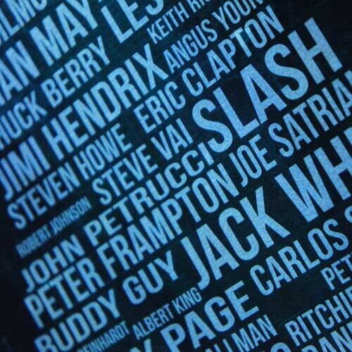 世界の著名なギタリスト達の名前でギターをデザインしています。