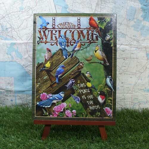 たくさんの小鳥たちがデザインされたブリキ看板です。