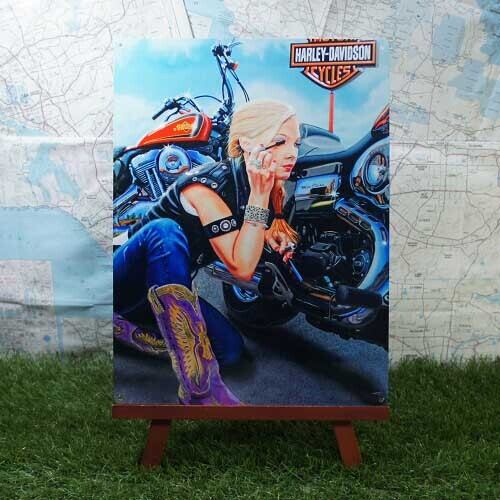 ハーレーに映る自分を見ながら化粧をする女性のデザインです。