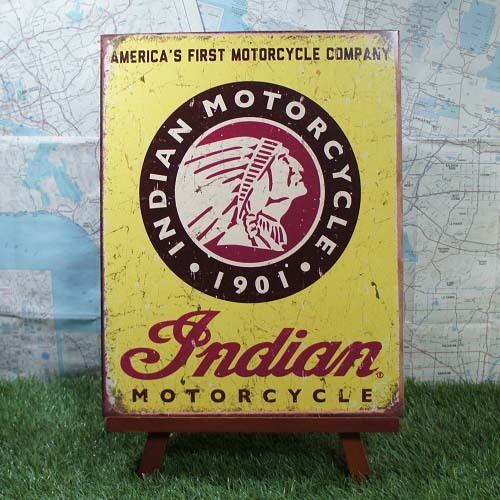 アメリカで最も古いオートバイブランド「インディアン」のブリキ看板です。